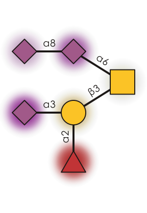 GlycoDraw("Fuc(a1-2)[Neu5Ac(a2-3)]Gal(b1-3)[Neu5Ac(a2-8)Neu5Ac(a2-6)]GalNAc", per_residue = [0.9, 0.7, 0.3, 0.2, 0.5, 0.1])